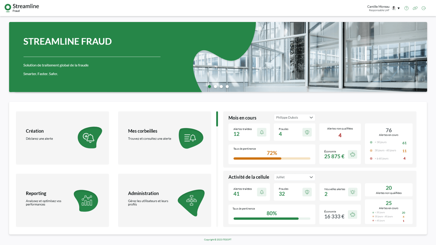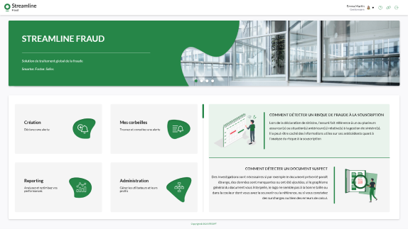 Streamline Fraud est la seule et unique solution qui permet de centraliser les alertes multicanales, qui propose un accompagnement méthodologique et structuré des investigations, et un reporting fiable et utile pour mesurer la robustesse du dispositif.