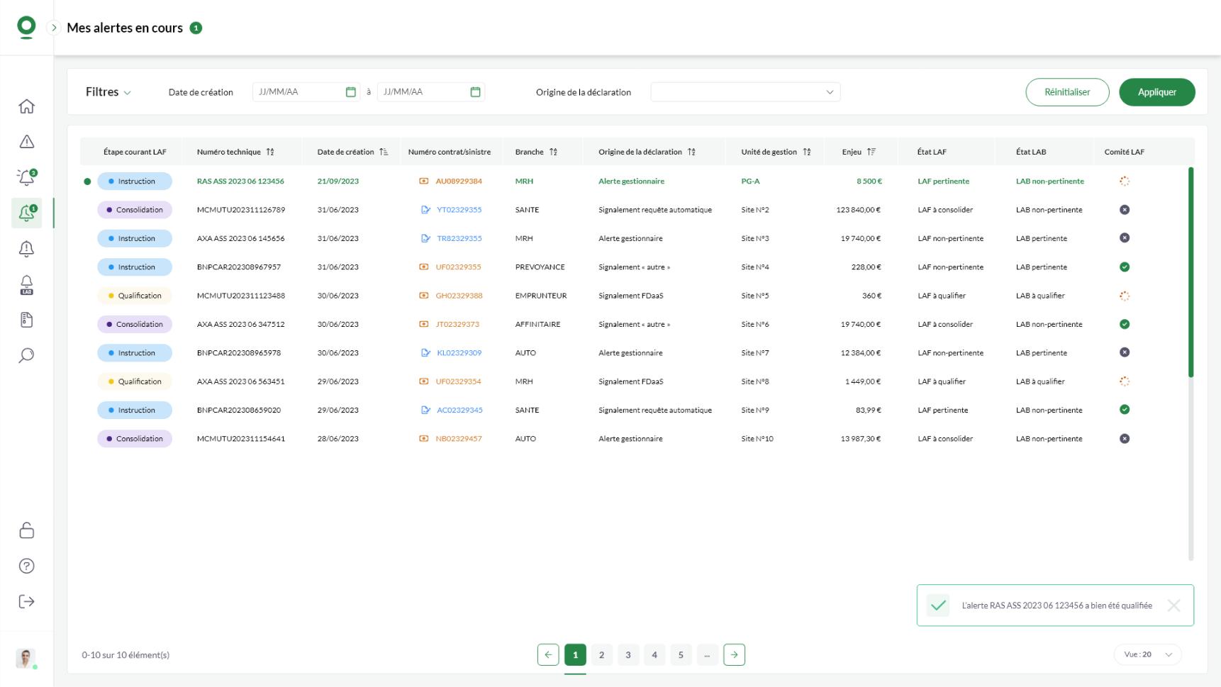 Pour cela, un score de criticité LCB-FT est affecté, et une qualification de l’alerte dans ce périmètre est réalisé par l’opérateur. S’il s’avère, que l’alerte LCB-FT est pertinente, une transmission de ce signalement est adressée au service de la conformité de cette entité.