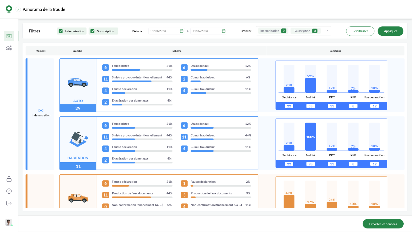 - Des dashboards actualisés en temps réel permettent une analyse fine de l’activité en cours et réalisée (délais de traitement, types de fraudes subies, sanctions prises, coûts/économies…)